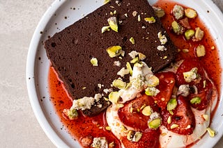 Baked Chocolate Mousse with Sumac Strawberries and Salted Pistachios